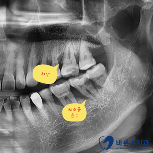 2)치주질환 잇몸 사진은 치석이 보이고 치조골 높이가 낮아지면서 잇몸뼈가 수직으로 흡수된 것이 보입니다.