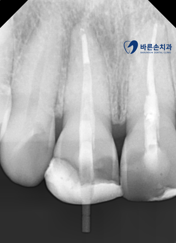 치아의 위치 변형도 생겨, 정복술을 한 후 근관치료를 진행하였습니다.
