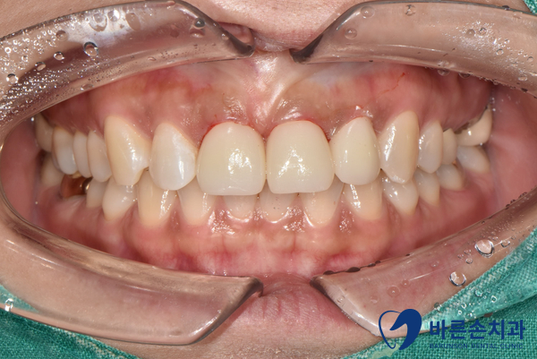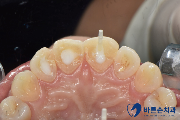 그 동안 부러진 앞니는 임시로 레진재료를 이용하여 원래의 치아 모양에 가깝게 쌓아 놓습니다.