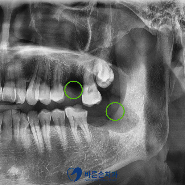 초록색 원 부위에는 추후 임플란트 및 뼈이식을 진행할 계획입니다