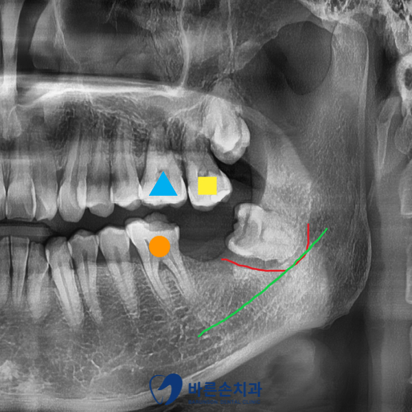 빨간 선 : 염증으로 인해 뼈가 내려가 있는 상태 ▷ 발치