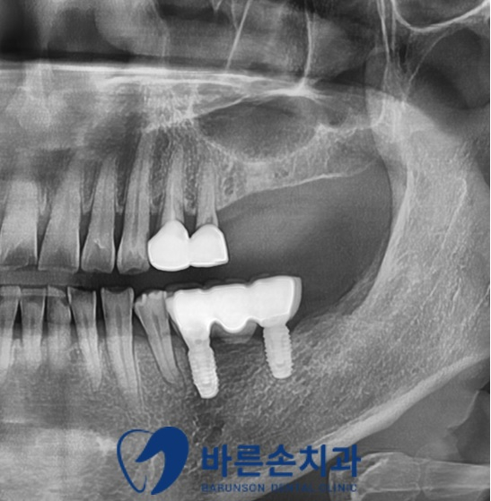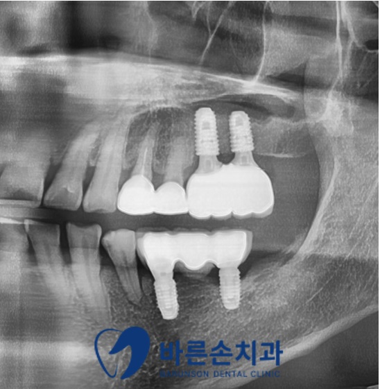 왼쪽 아래 임플란트들이 대합치가 없어 전혀 일을 하지 못하고 있는 상황이죠