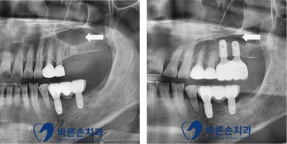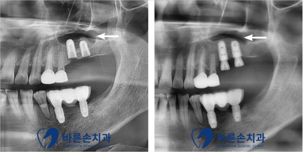 상악동 거상술과 함께 치조골 이식을 하면서 임플란트 식립을 하였고,