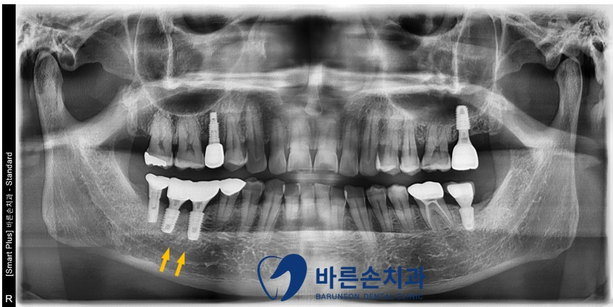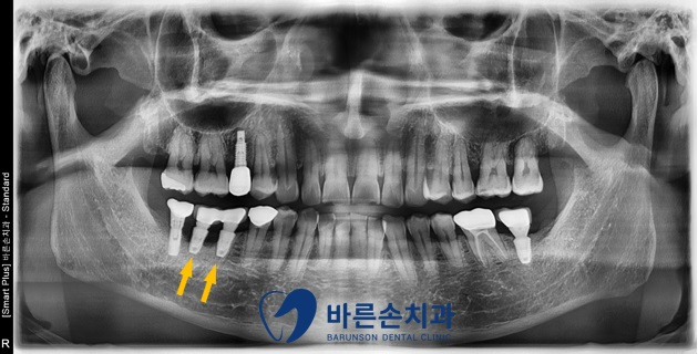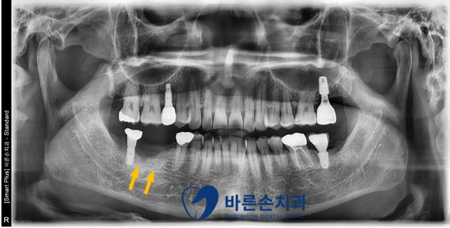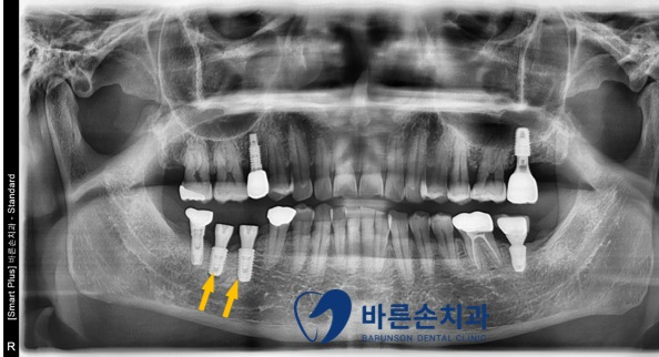 우측 아래 임플란트 2개(노란 화살표)가