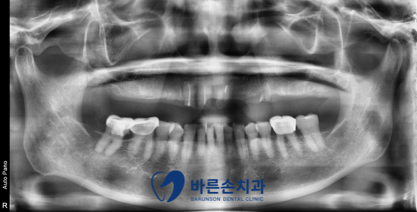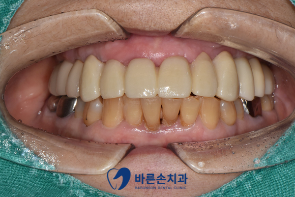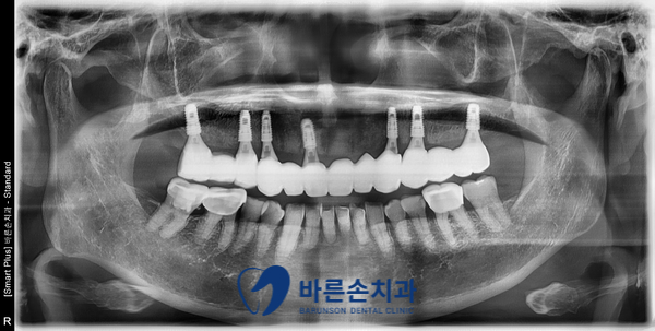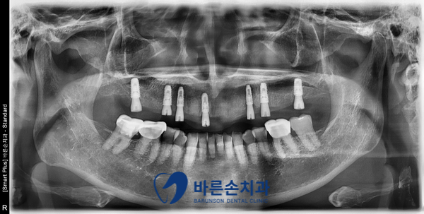 치아 뿌리를 제거하고, 7개의 임플란트 식립 . (틀니 사용 X)