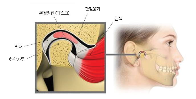 하악과두와 측두골의 측두와 사이에 디스크가 완충작용 역활을 합니다